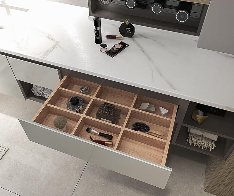 【功 能】:半圆发光镜灯光柔和氛围感十足;双开门+抽屉大容量储物收纳极强;梳妆区配备可移动插座跟具需求移动位置方便使用
