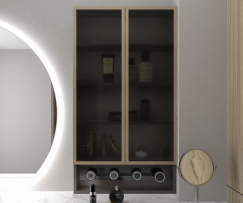 【材 质】:门板:多层实木油漆板板亮光浅灰+铝框玻璃门